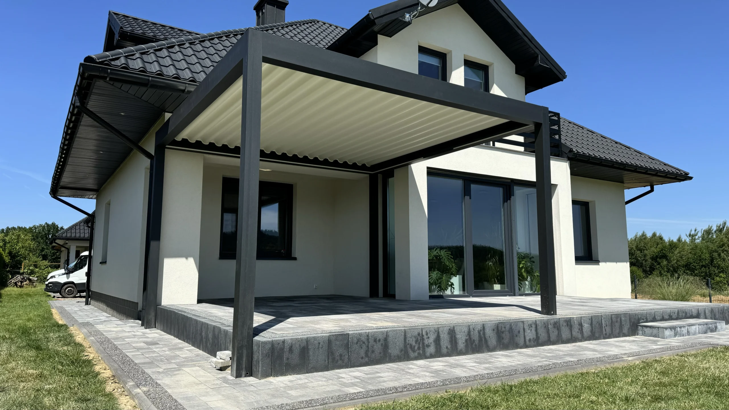 Pergola może być elementem budynku lub konstrukcją ogrodową. Proponujemy m.in. pergole lamelowe z piórami umożliwiającymi zmianę kąta nachylenia – dzięki temu precyzyjnie regulujesz ilość światła.